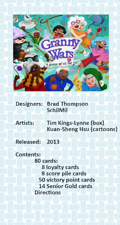Granny Wars is a fast-playing game of secret identities, bluffing, and cunning senior tricks. This year Nana needs your help to keep up her streak as the town's top handicrafter. Be crafty as you needle the other nans: if the other players figure out she's your nan, they'll stitch her up.
