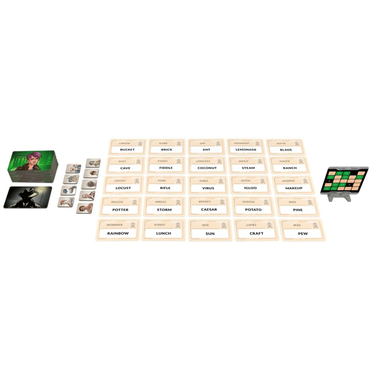You’ll take turns giving one-word clues paired with a number, pointing the operative(s) across from you to specific words on the grid. Guess right? Keep going. Guess a bystander? Your turn ends. Guess an assassin? Mission failed — game over. But as long as your guesses are correct, you can keep going, even revisiting past clues.